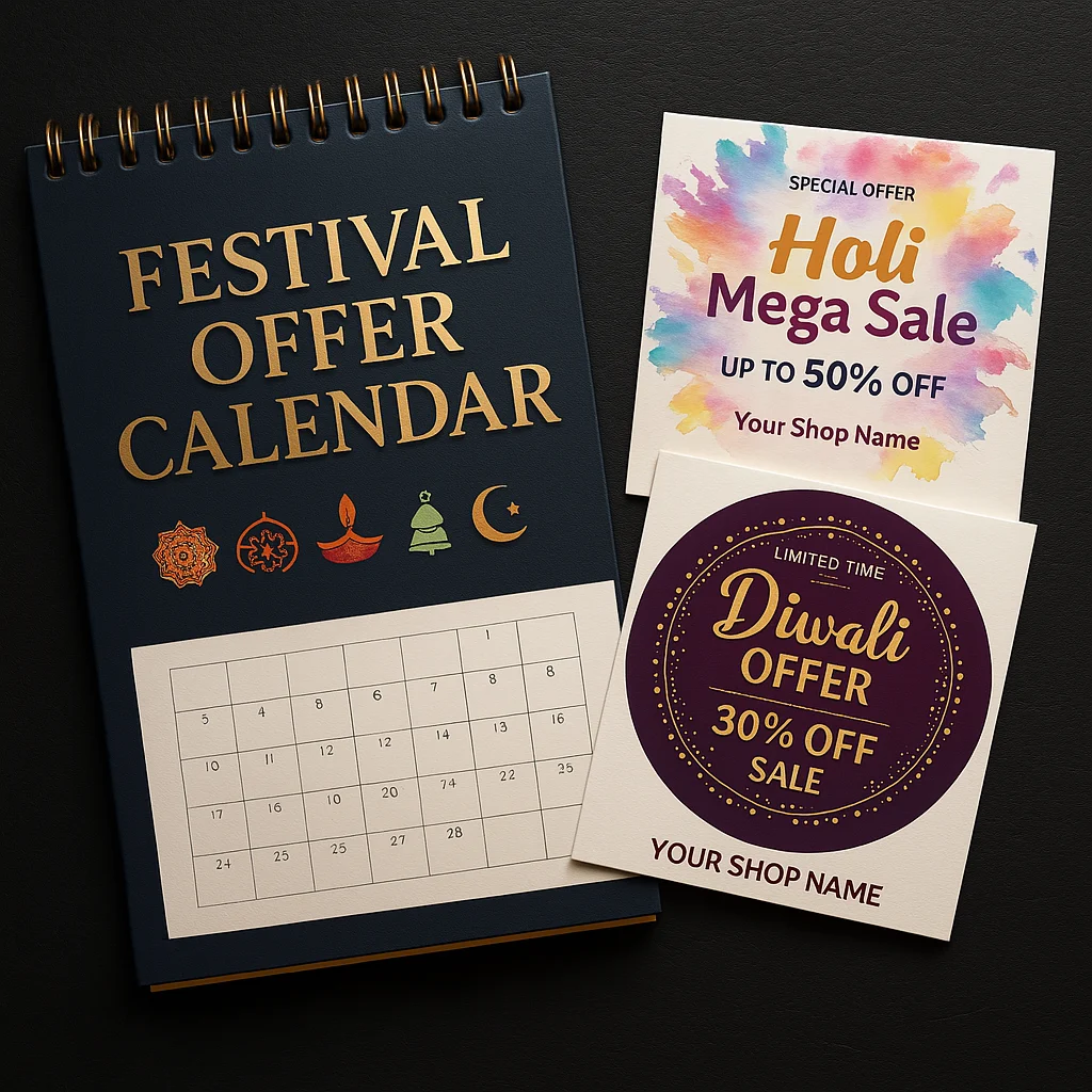 Get pre-designed offer ideas and beautiful templates for Holi, Diwali, Rakhi, Eid, Christmas & more — just add your details and go live.